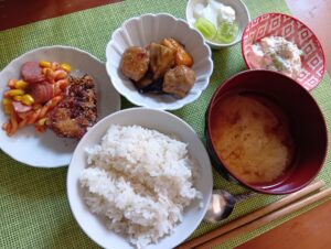 鶏とレンコンの甘酢炒め、胡瓜と茄子と茗荷のピリ辛和え、ほうれん草と茗荷のお味噌汁、ごはん、お豆