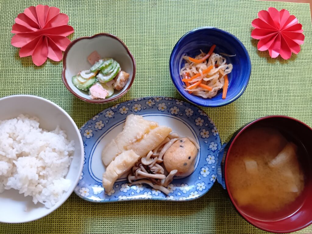 カレイの煮付け/切り干し大根/きゅうりとハム、ちくわのサラダ/ナスと油揚げの味噌汁