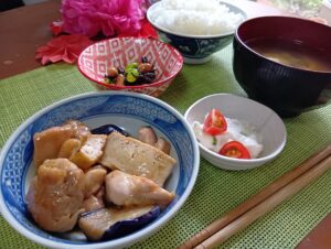 鶏肉と厚揚げの照り焼き*ポテトサラダ*煮豆ひじき*お味噌汁*ごはん