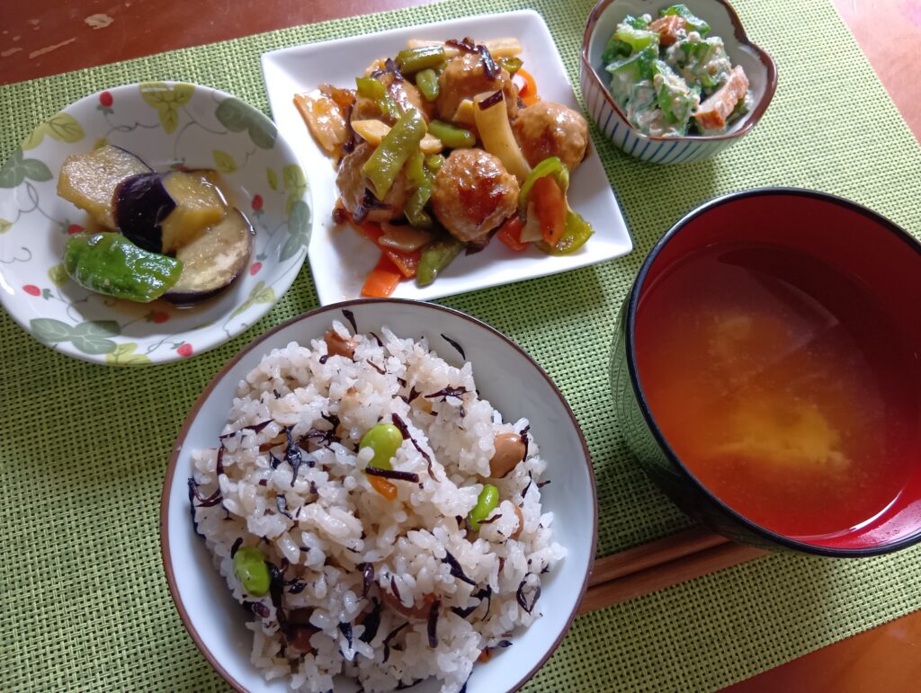 肉団子と中華野菜のスタミナ炒め、茄子とししとうの焼き浸し、オクラとさつま揚げのゴマ和え、お味噌汁、ひじきごはん