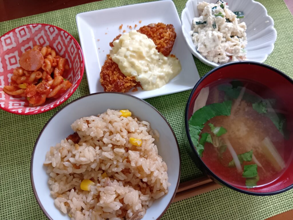 2025年10月13日 / 最終更新日時 : 2025年10月13日 minamiooizumikapp 今日のお昼ごはん サーモンフライ タルタルソース、ミョウガの白和え、アラビアータパスタ、お味噌汁、ごはんFacebookXBlueskyHatenaCopy