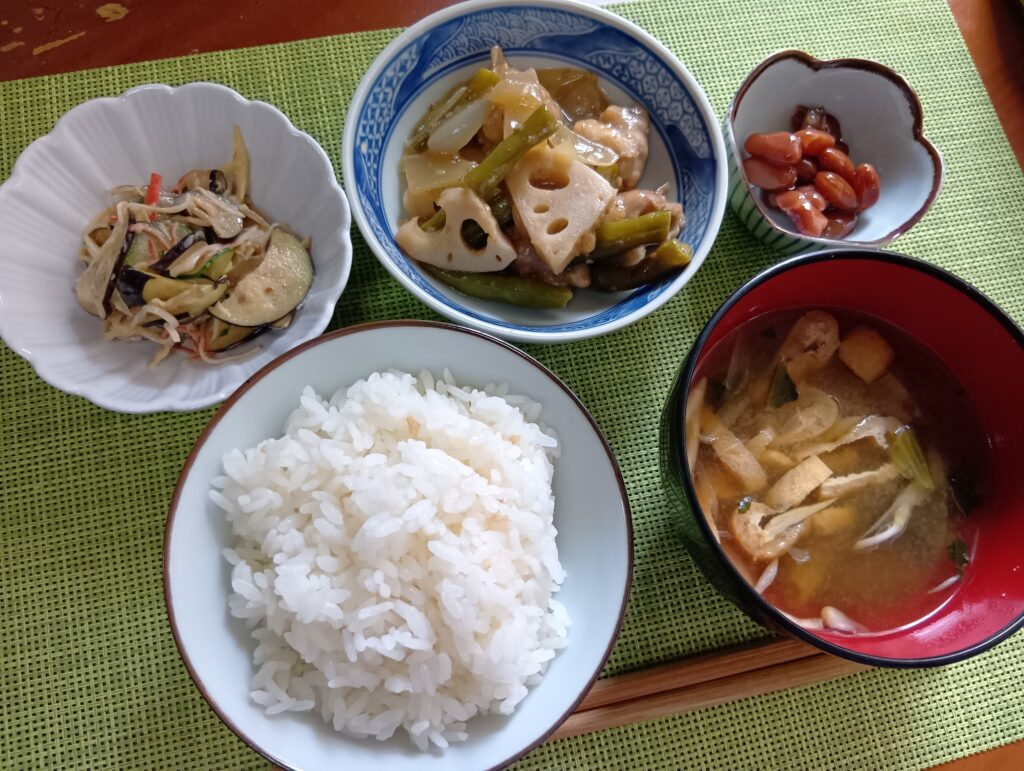 • 鶏とレンコンの甘酢炒め、胡瓜と茄子と茗荷のピリ辛和え、ほうれん草と茗荷のお味噌汁、ごはん、お豆