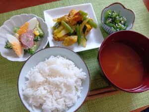 鶏と南瓜のバター焼き、ブロッコリーの玉子サラダ、オクラと茗荷のゆかり和え、南瓜のお味噌汁、ごはん