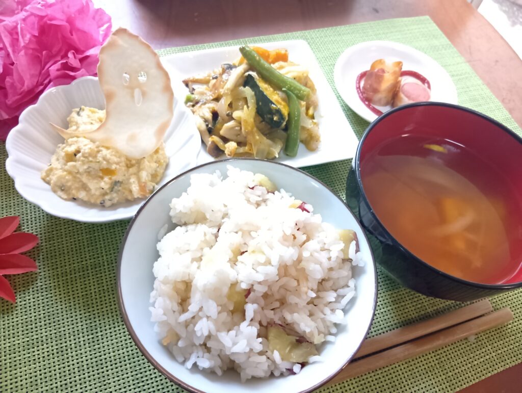 3. ハロウィン!南瓜と鶏肉のバターソテー、南瓜の白和え、カリカリウインナー、南瓜と玉ねぎの柚子入りお味噌汁、さつま芋ご飯