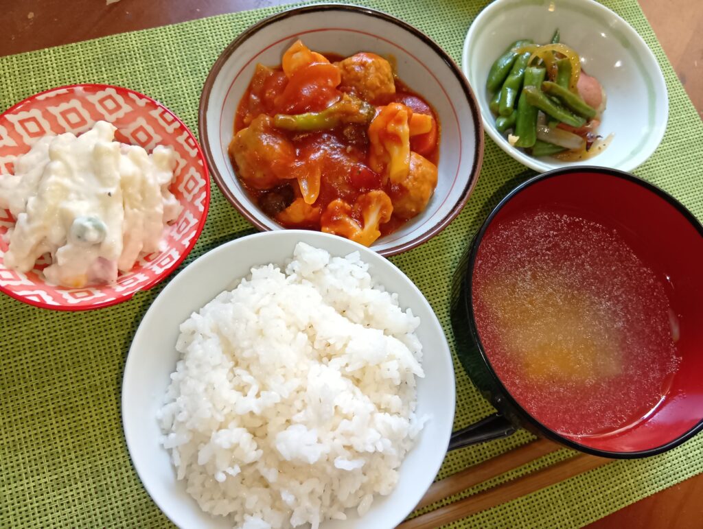 肉団子のトマト煮込み、ウインナーといんげんのバター炒め、ポテトマカロニサラダ、コーンベーコンスープ、ごはん