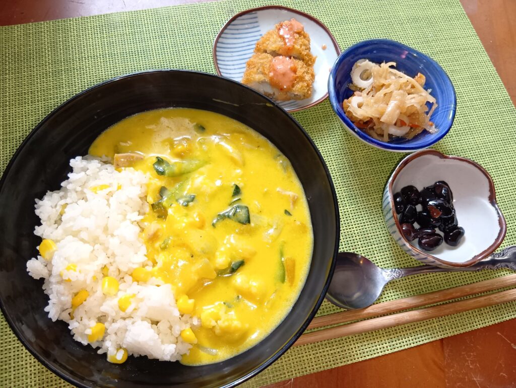 2025年12月5日 / 最終更新日時 : 2025年12月5日 minamiooizumikapp 今日のお昼ごはん 南瓜のチキンシチュー、コーンバターライス、白身魚のフライ チリマヨソース、切り干し大根、黒豆FacebookXBlueskyHatenaCopy