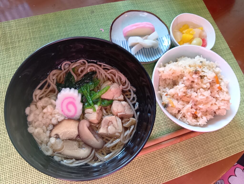年越しそば、あさりの炊き込みご飯、飾り切りかまぼこ、フルーツ
