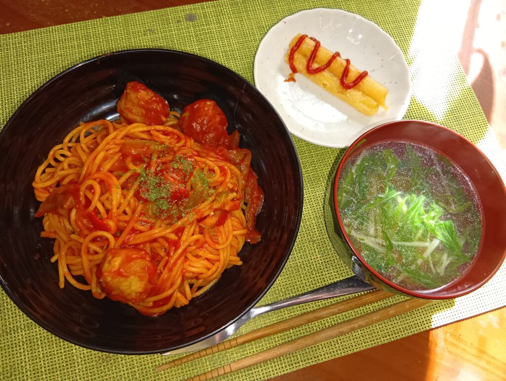 ミートボールナポリタン、チーズスティック、枝豆コーンと水菜のコンソメスープ