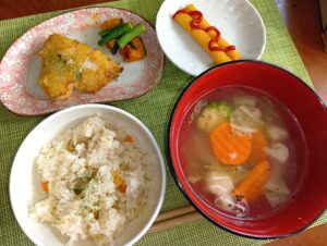 かしわめし、肉団子と蓮根の中華塩炒め、オニオン竹輪サラダ、豚汁