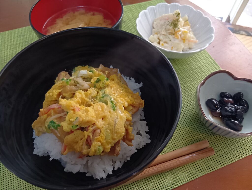 3. 親子丼*マカロニコーンサラダ*黒豆*お味噌汁