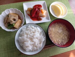 白身魚の竜田焼き甘酢あんかけ、れんこんと厚揚げの中華炒め煮、豆腐と卵の中華とろとろスープ、ごはん、りんご