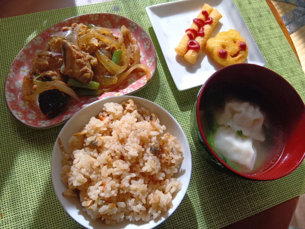 • 鶏と厚揚げの甘辛炒め煮、水餃子、パスタサラダ、あさりとごぼうの炊き込みご飯、柚子入りお味噌汁