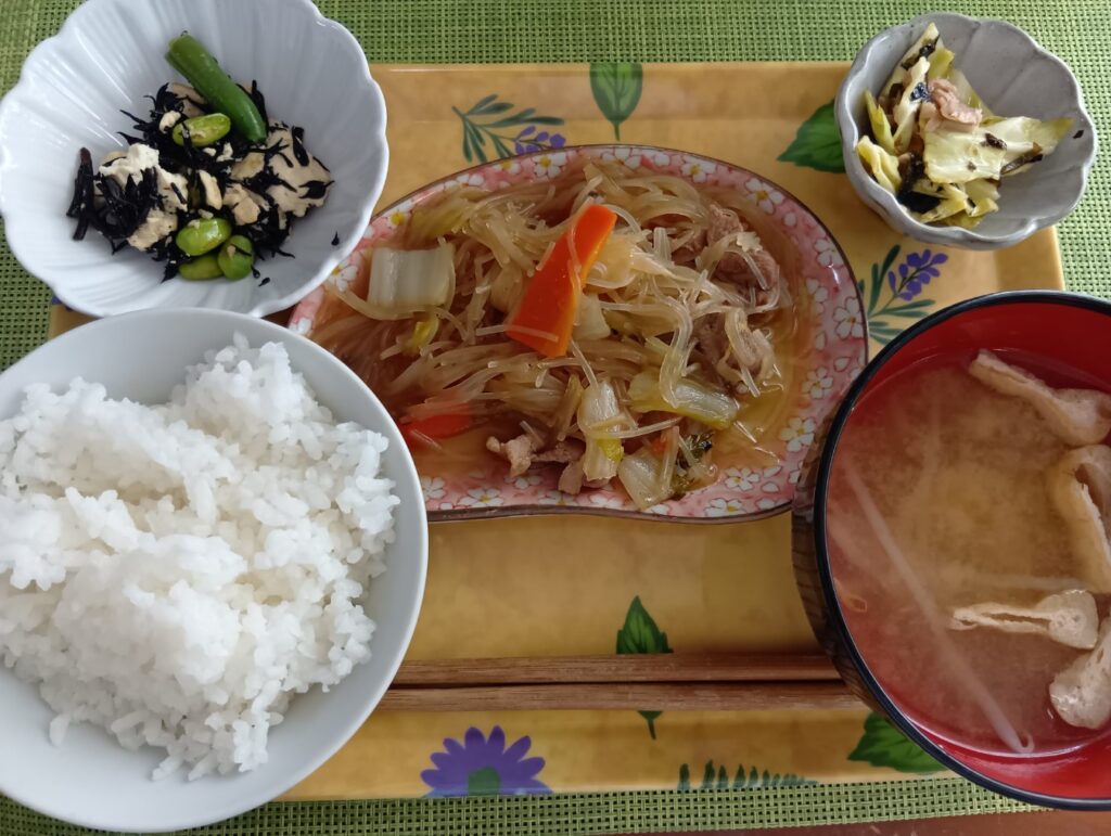 豚キムチ、厚揚げとひき肉のオイスター炒め、白和え、ひじきご飯、お味噌汁