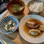 茄子焼きの大根おろし添え、根菜と厚焼玉子、ワカメときゅうりの酢の物、味噌汁、ご飯