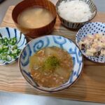 鶏肉と根菜の煮物、マカロニサラダ、いんげんの胡麻和え、味噌汁、ごはん