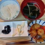 • 肉団子のトマト煮、大豆煮、漬物、御飯、味噌汁