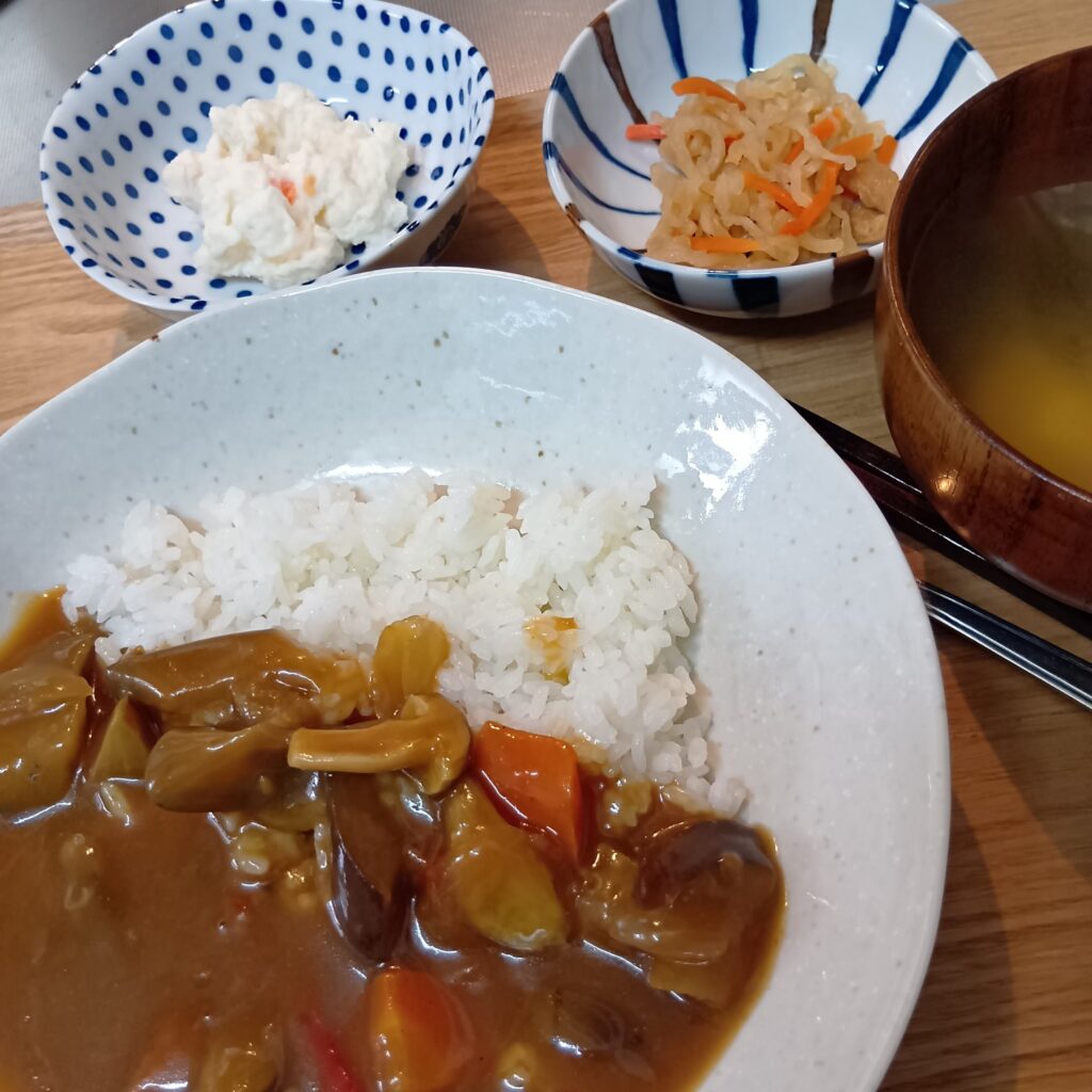 3. 茄子カレー🍛 ポテトサラダ 切干大根 お味噌汁