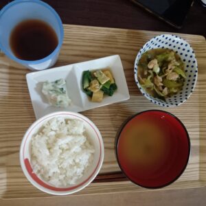 回鍋肉、小松菜の煮付、ポテトサラダ、大根のみそ汁