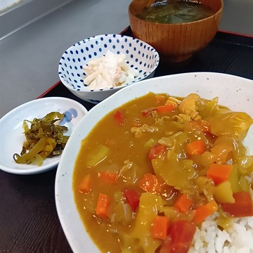 • チキンカレー、マカロニサラダ、高菜漬け、味噌汁