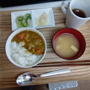 チキンカレー、大根のみそ漬け、きゅうりとらっきょの和え物、山芋の味噌汁