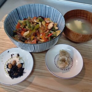 中華風野菜丼、焼売、ひじき煮、味噌汁