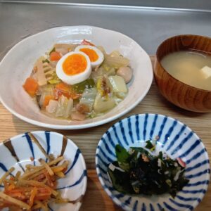 • 中華丼、きんぴらごぼう、ワカメ、きゅうりとしらすの酢の物、味噌汁