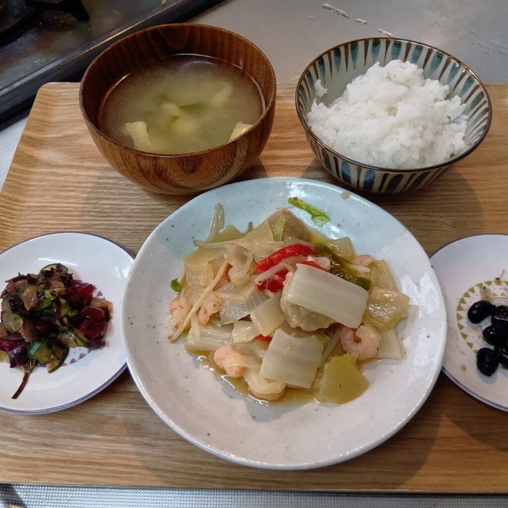 2026年2月8日 / 最終更新日時 : 2026年2月8日 asagaya3bell 今日のお昼ごはん 白菜他野菜と小海老の炒め物、しば漬け、黒豆、御飯、味噌汁FacebookXBlueskyHatenaCopy