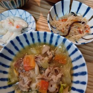• 豚肉の白菜シーフード煮込み ポテトサラダ 春雨と人参の和え物 御飯 お味噌汁
