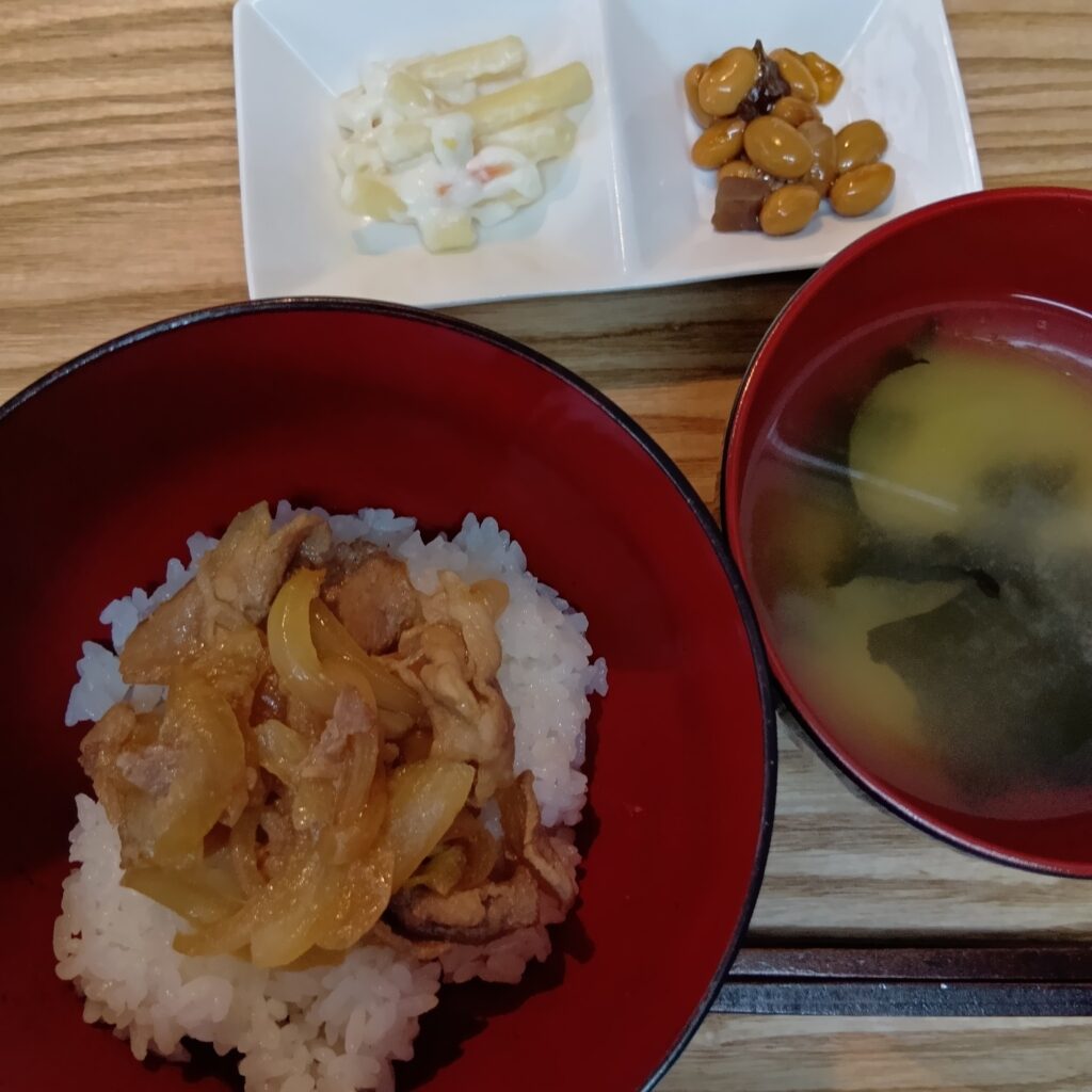 3. 焼肉丼 大豆の煮豆 マカロニサラダ 味噌汁