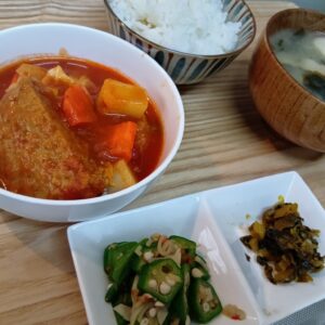 • 野菜とハンバーグのトマト煮 オクラとカニカマのおかか和え 高菜漬け ごはん 味噌汁