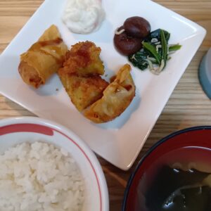 • ミックスフライ 椎茸とほうれん草の煮物 ポテトサラダ 味噌汁 御飯