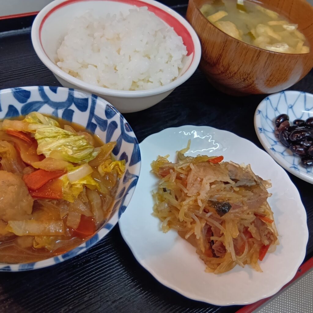 中華風炒め 春雨炒め 黒豆 ごはん 味噌汁