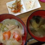 豚肉と大根の煮物 もやしのナムル 茄子とカニカマの甘酢あん 味噌汁