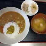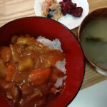 チキンカレー 煮豆 スパゲティーサラダ ワカメスープ