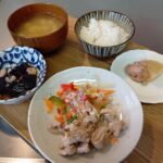 蒸し鶏のサラダ添え、茄子の煮浸し、大根煮、味噌汁、御飯