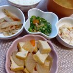 かぼちゃシチューライス、春雨サラダ、ポテトサラダ、スープ