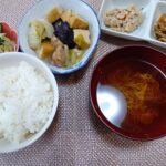 野菜コロッケ、かぼちゃのそぼろ煮、つぼ漬け、ポテトサラダ、お味噌汁