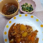 カレーライス、もやしナムル、大豆煮、ゴボウサラダ、味噌汁