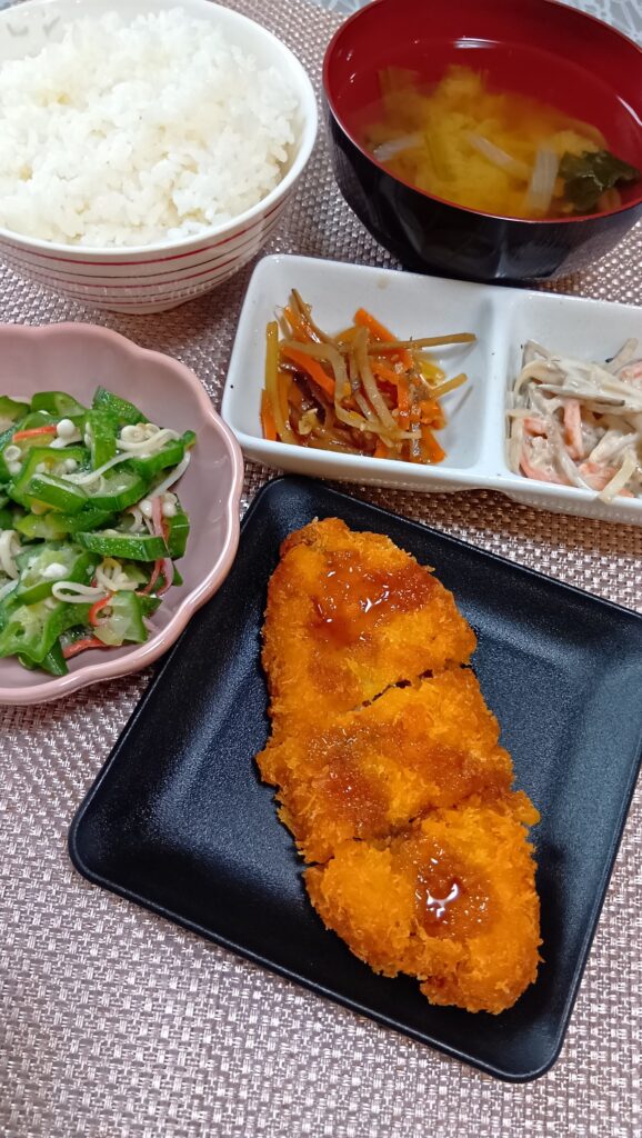 サーモンフライ、オクラとカニカマ和え、ゴボウサラダ、金平、お味噌汁