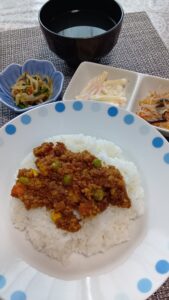 キーマカレー、もやしと菜の花のポン酢和え、春雨サラダ、マカロニサラダ、スープ