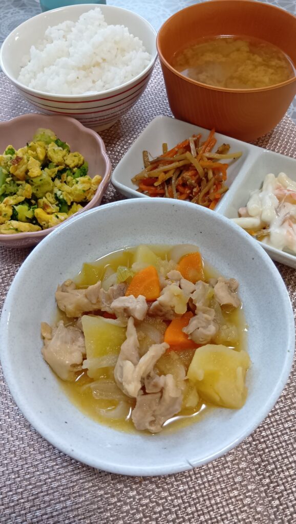鶏肉じゃが、ブロッコリーと玉子炒め、マカロニサラダ、きんぴらごぼう、ごはん、味噌汁
