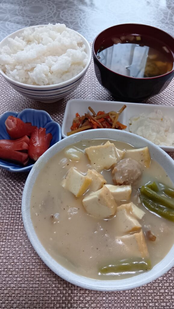 • クリームシチュー、タコさんウィンナー、金平、ポテトサラダ、お味噌汁