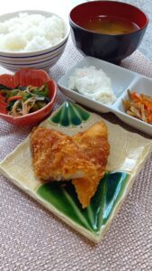 • 白身フライ、菜の花のポン酢和え、きんぴらごぼう、ポテトサラダ、ごはん、味噌汁