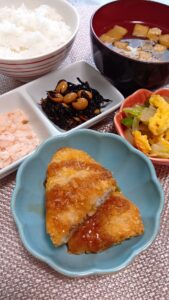 白身フライ、キャベツと玉子炒め、タラモサラダ、ひじき煮、ごはん、味噌汁