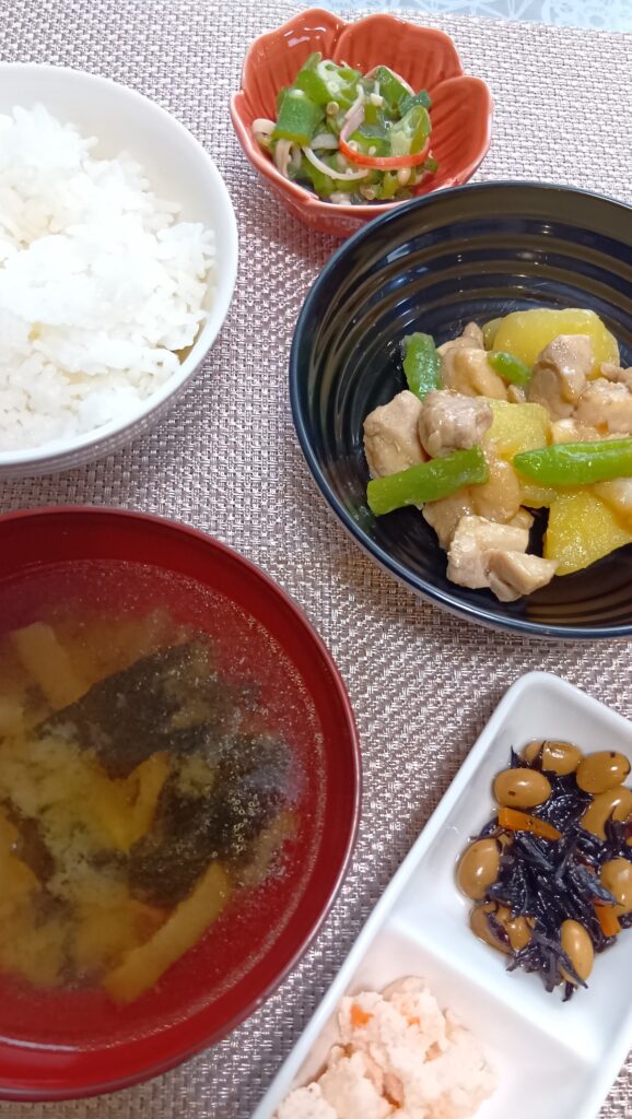 豚肉野菜炒め、しらたき金平、マカロニサラダ、ひじき煮、ごはん、味噌汁