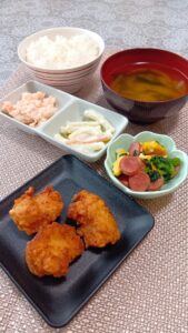 • 鶏肉と野菜炒め、えのきのナムル、マカロニサラダ、タラモサラダ、味噌汁
