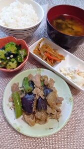• 豚肉となすの味噌炒め、ブロッコリーのポン酢和え、ポテトサラダ、金平、お味噌汁