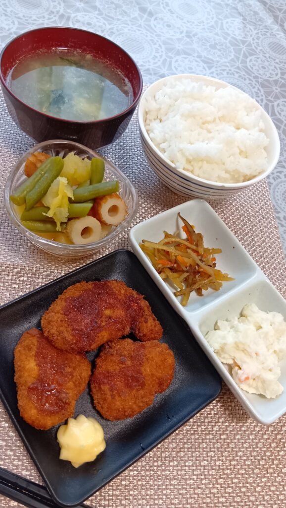 キチンとしたチキンカツ、ニッコニコな煮っころがし、ポテっとポテトサラダ、きんぴらキラキラ、スープププ