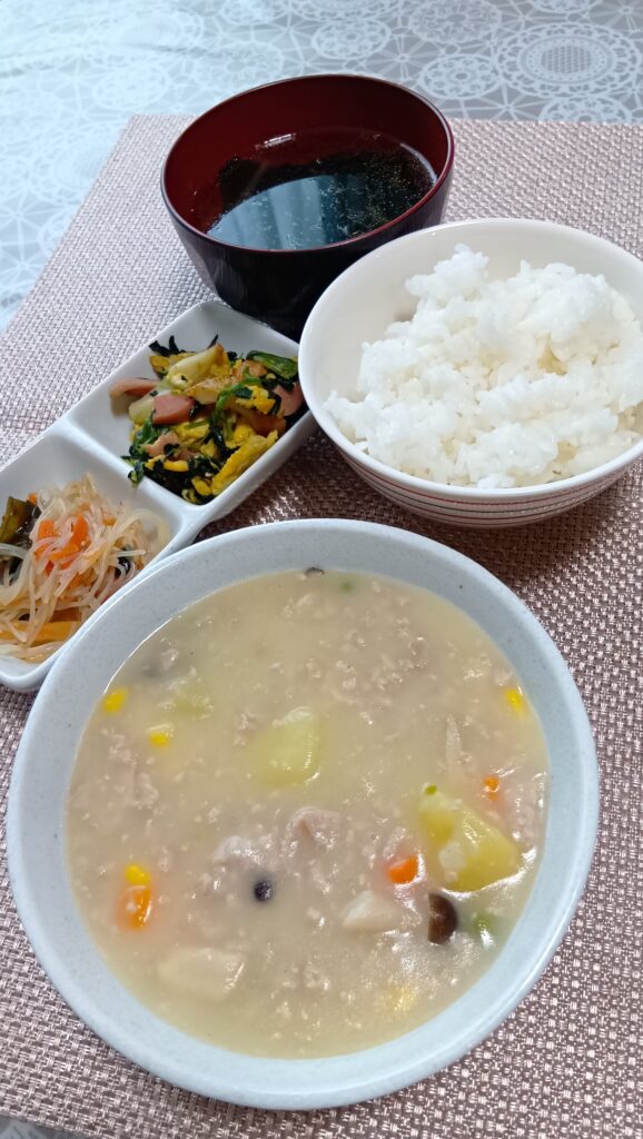 2025年11月18日 / 最終更新日時 : 2025年11月18日 asaka3bell 今日のお昼ごはん クリームシチュー、ほうれん草と玉子のソテー、春雨サラダ、スープFacebookXBlueskyHatenaCopy