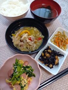 2025年12月9日 / 最終更新日時 : 2025年12月9日 asaka3bell 今日のお昼ごはん チキンのトマト煮、厚揚げとかぼちゃの煮物、ひじき煮、金平、お味噌汁FacebookXBlueskyHatenaCopy
